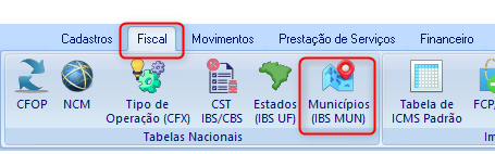 📍 Menu Fiscal → Tabelas Nacionais → Municípios (IBS MUN)