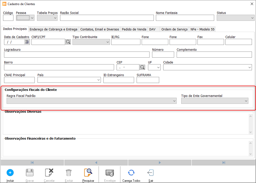 Para suportar o novo Sistema Inteligente Fiscal, o cadastro de clientes recebeu uma nova área dedicada às informações fiscais.