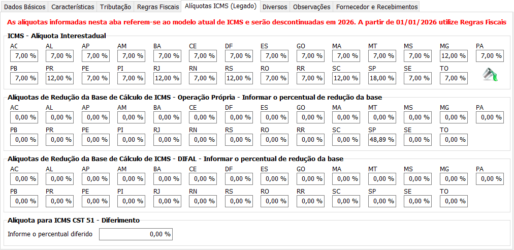 • A aba “Alíquotas ICMS (Legado)” não deve ser atualizada para novos cenários fiscais.