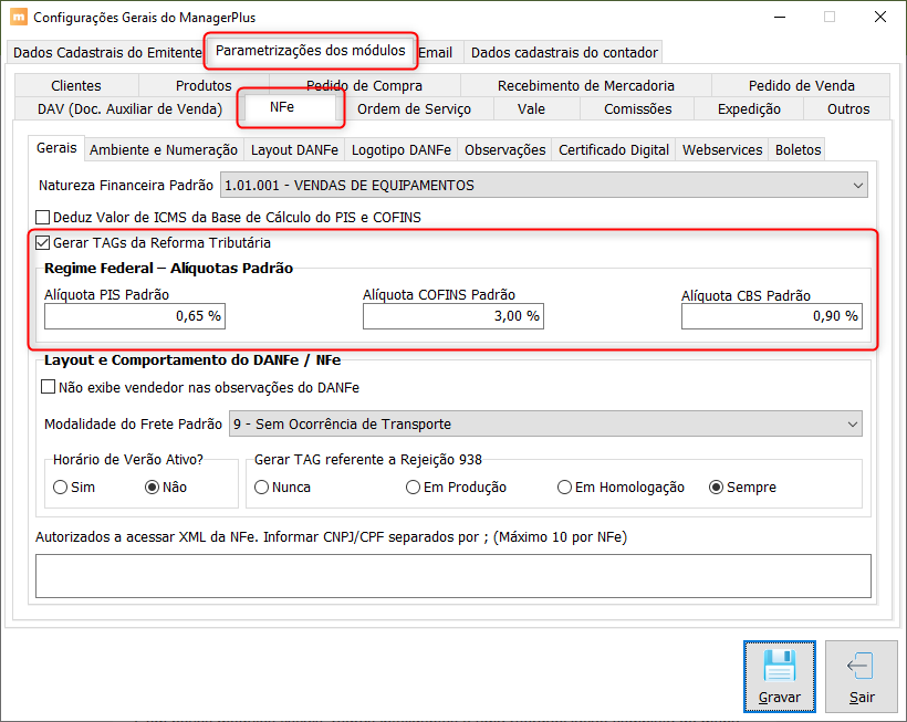 • Definir alíquotas padrão de PIS, COFINS e CBS para uso nas TAGs da NFe.