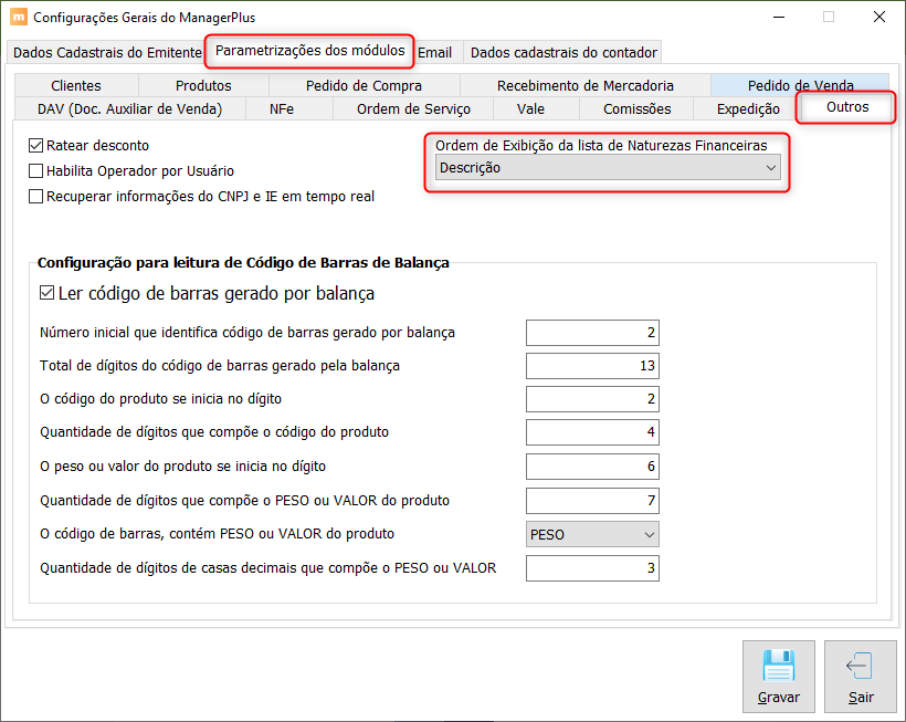 2. Vá na guia Parametrizações dos módulos e clique em Outros.