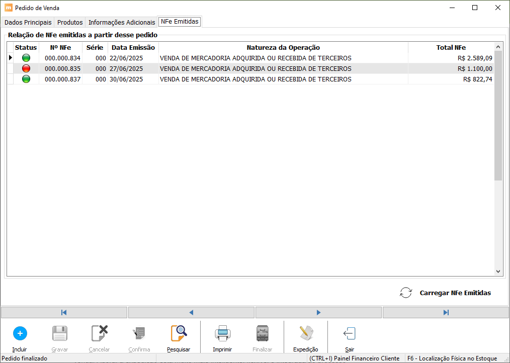 A aba passa a listar todas as NF-e vinculadas ao pedido, independente de terem sido emitidas importadas diretamente do Pedido de Venda ou a partir de Expedições.