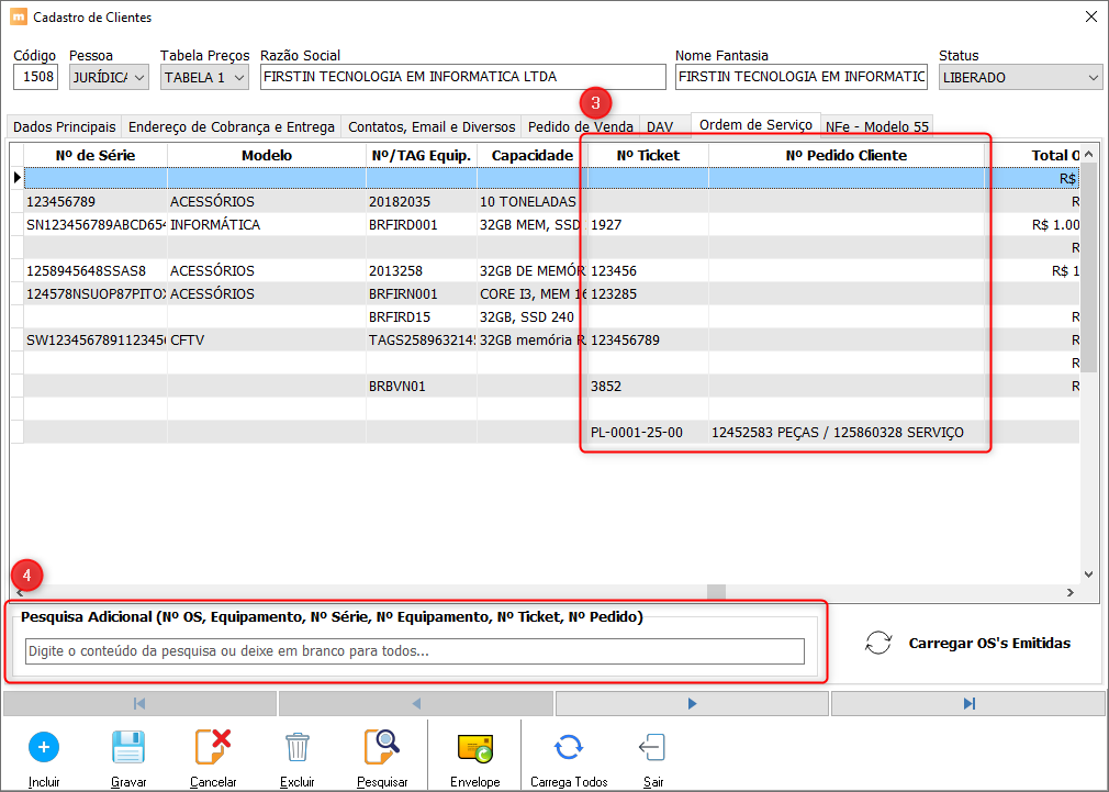 Essas informações também estão disponíveis na listagem de OS no cadastro de clientes, com filtro adicional por vários campos (OS, equipamento, série, ticket, pedido etc.).