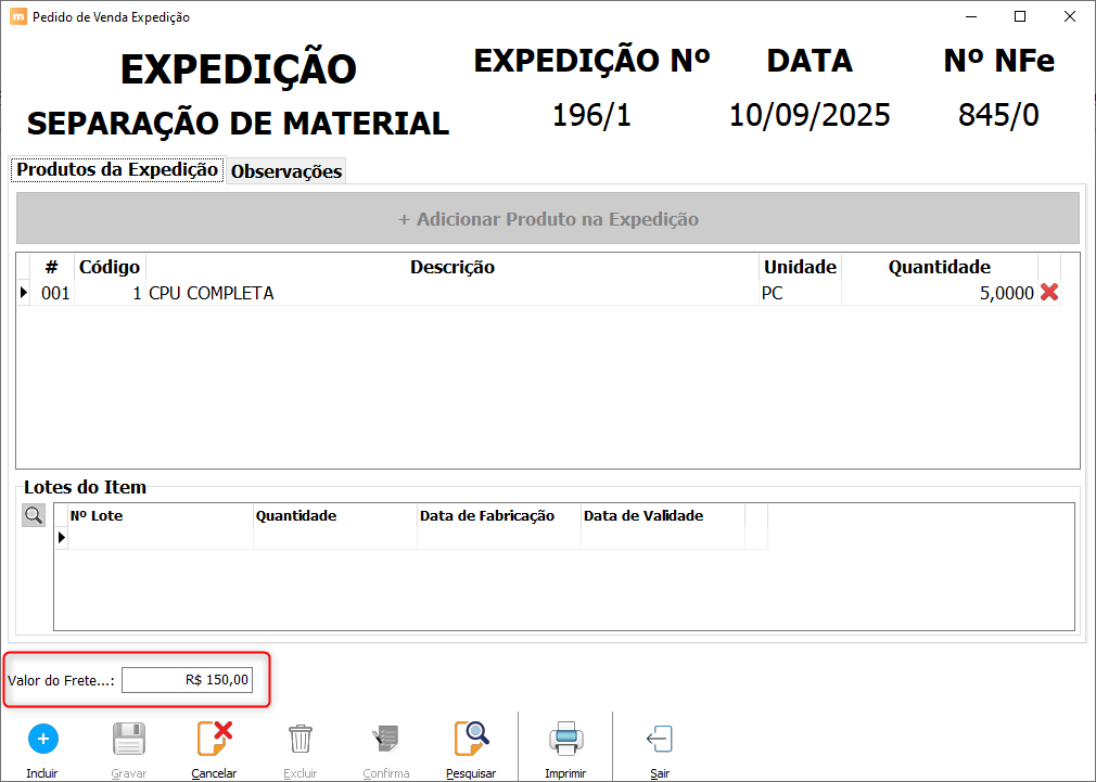 3. Se houver várias expedições → os valores de frete são somados.