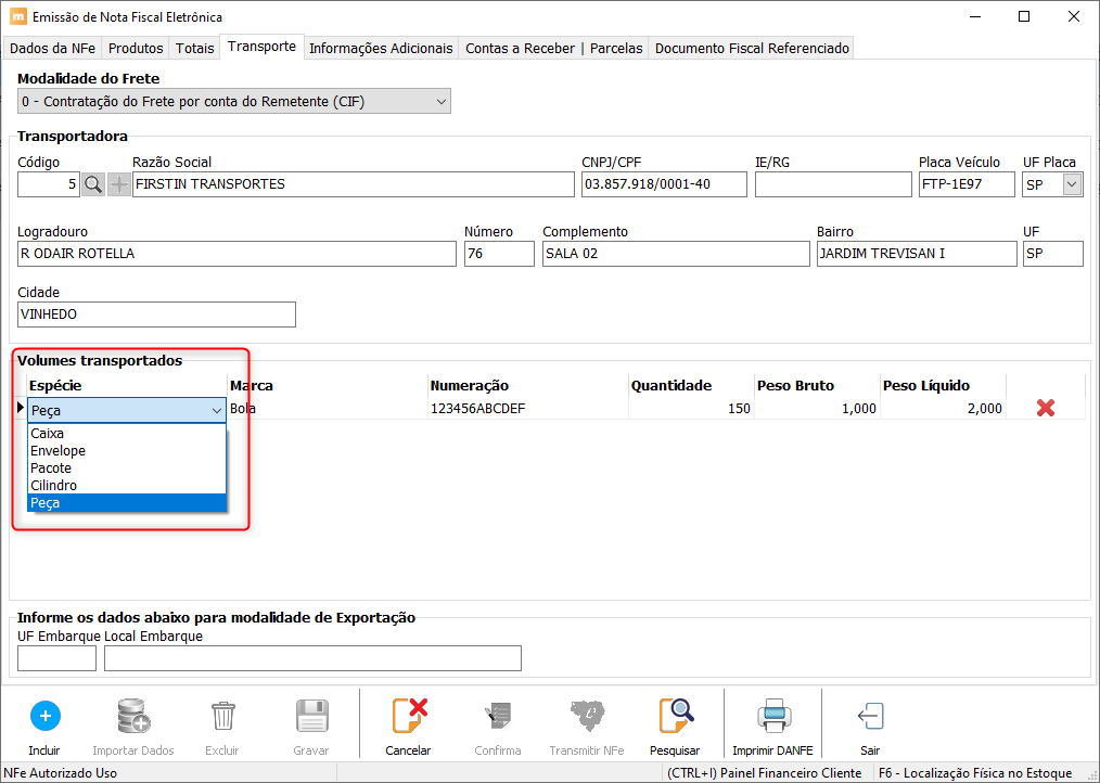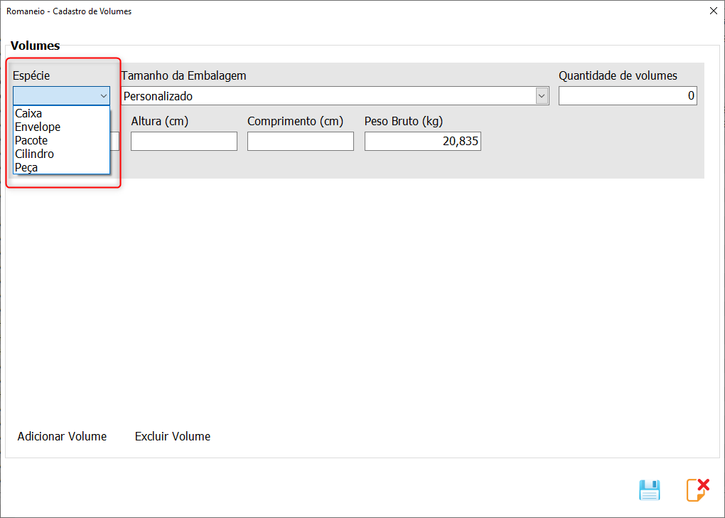 • Adicionada a espécie “Peça” na lista de embalagens disponíveis tanto na NFe quanto no Romaneio.