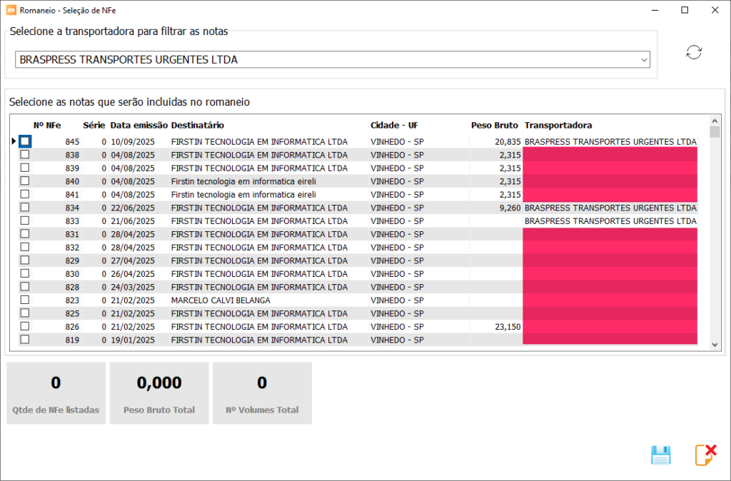 Após escolher uma transportadora e atualizar a visualização, além das notas com a transportadora vinculada, todas as demais notas sem transportadora vinculada serão exibidas permitindo a inclusão no romaneio.